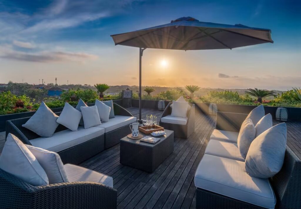 End your day with golden hour views from the rooftop terrace—a cozy lounge with 180-degree panoramas of Uluwatu’s coastline. It’s the perfect spot for a sunset cocktail, yoga session, or an intimate candlelit dinner under the stars.